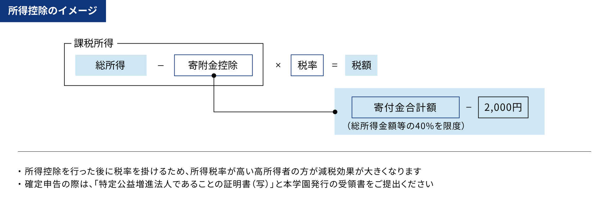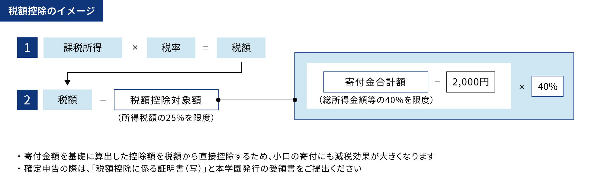 本学園の寄付に対しては税制上の優遇措置(「寄付金控除」の制度)を受けることができます。確定申告の際は所得控除制度と税額控除制度のうち、寄付者(納税者)が、どちらか一方の制度を選択することができます。