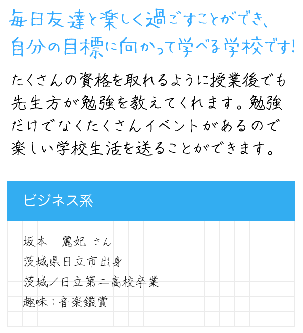 大原学園には、夢と希望をいっぱいに頑張っている先輩がたくさんいます。そんな充実した学園生活を送っている先輩たちの元気な生の声をお届けします!