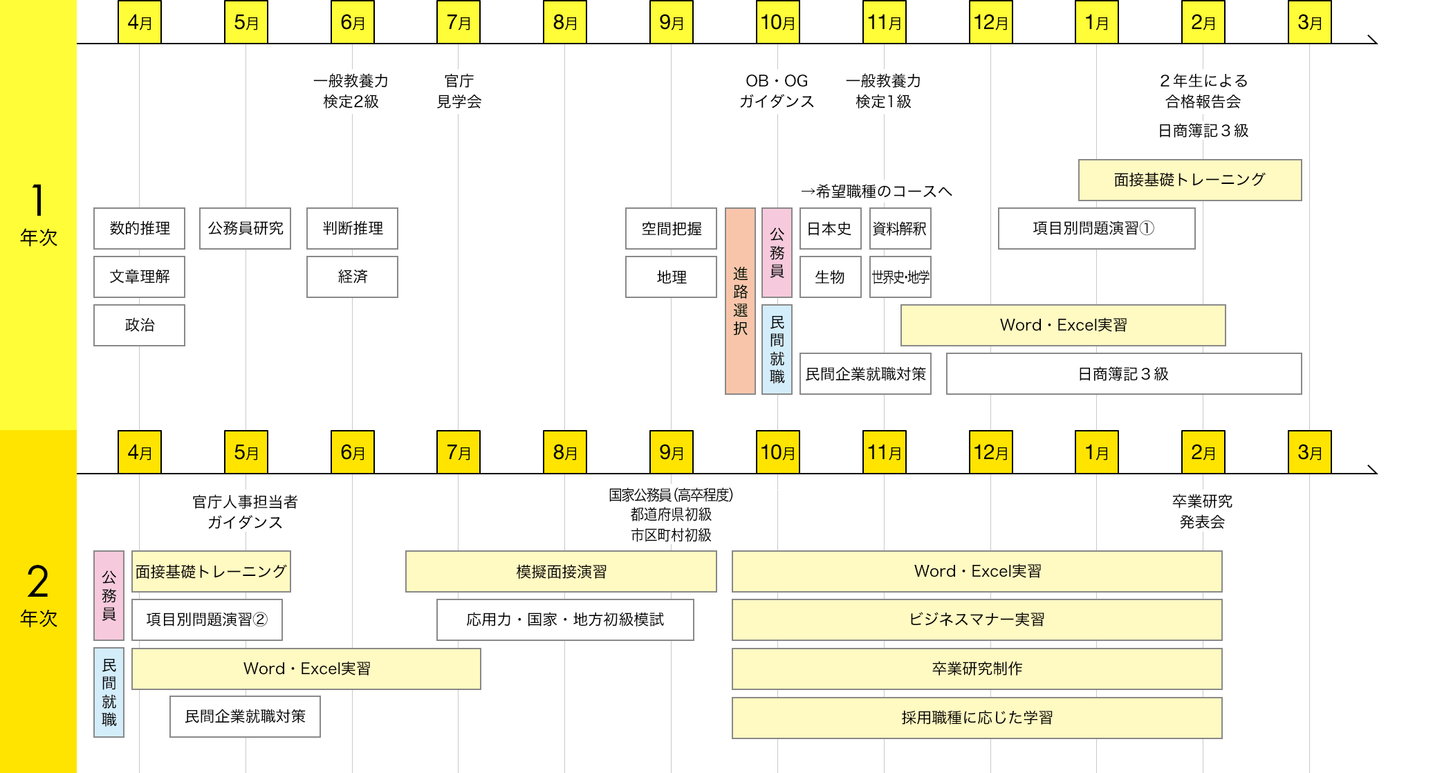 1年目は合格目標に備えたカリキュラムではない為、公務員試験受験は現実的に難しいです。1年目の受験を希望であれば、1年制コースをお勧めします。