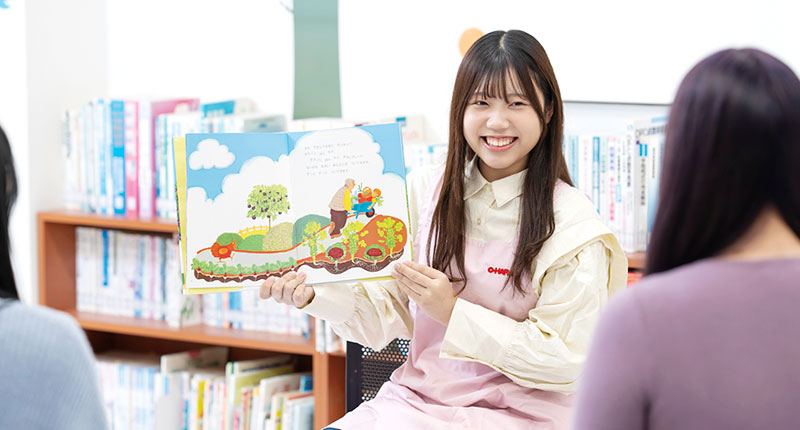 授業では読み聞かせの実践が行われます。クラスメイトの前で絵本を読むのはとっても緊張しますが、徐々に慣れてくるから大丈夫!繰り返し練習することで読み聞かせをする技術が身につきます。