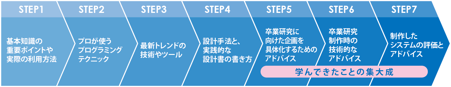 システム開発の基礎を学習後、コース毎にシステム開発の応用授業、AIデータサイエンスの基礎授業などを行います。