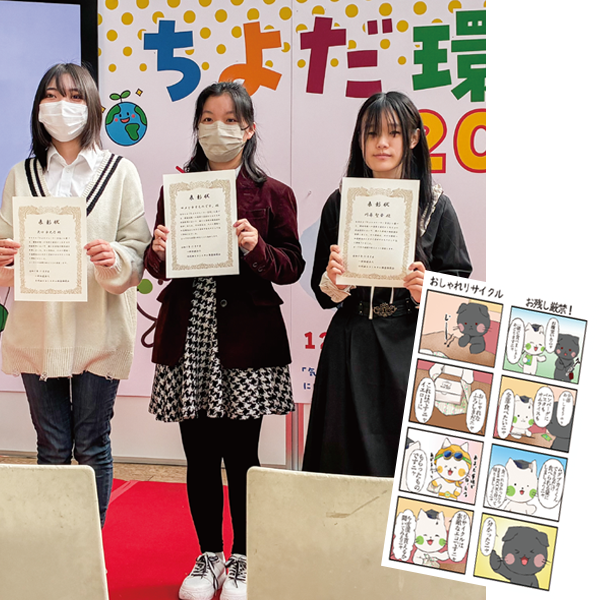 キャラクターイラストコースの在学生が「ちよエコヒーロー宣言」(環境配慮に関する行動)をテーマにした4コマ漫画を描き、「ちよだ環境フェア」にて表彰されました。