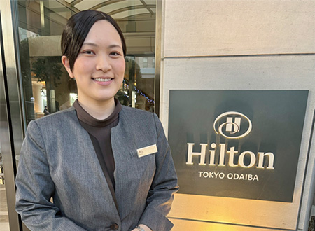- ホテルのロビーにてお客様をお迎えします。お辞儀や立ち居振る舞いなど、日頃の訓練の成果を発揮できます! 撮影協力:ヒルトンお台場東京