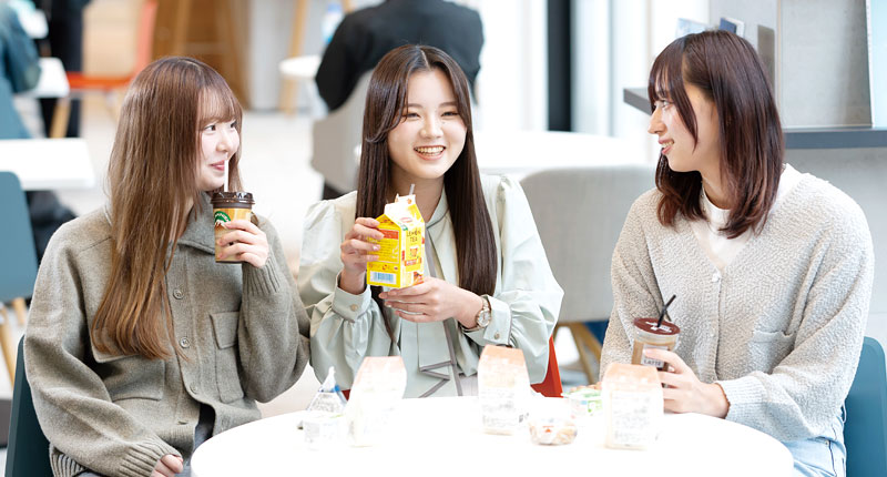 校内にはおしゃれなカフェスペースやロビーがあるので、友達とお昼を食べたり、おしゃべりしたり、リラックスして過ごせます。
