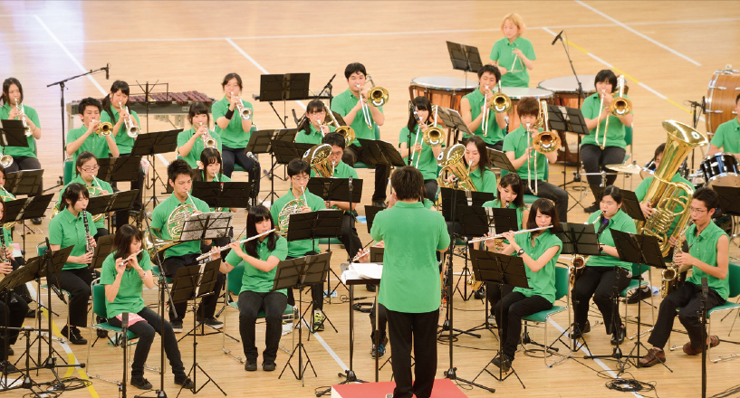 スポフェスでの発表に向けてみんなで楽しく練習しているよ。いろんな学校の人と一緒に演奏することもあるから、友達の輪もきっと広がるはず。